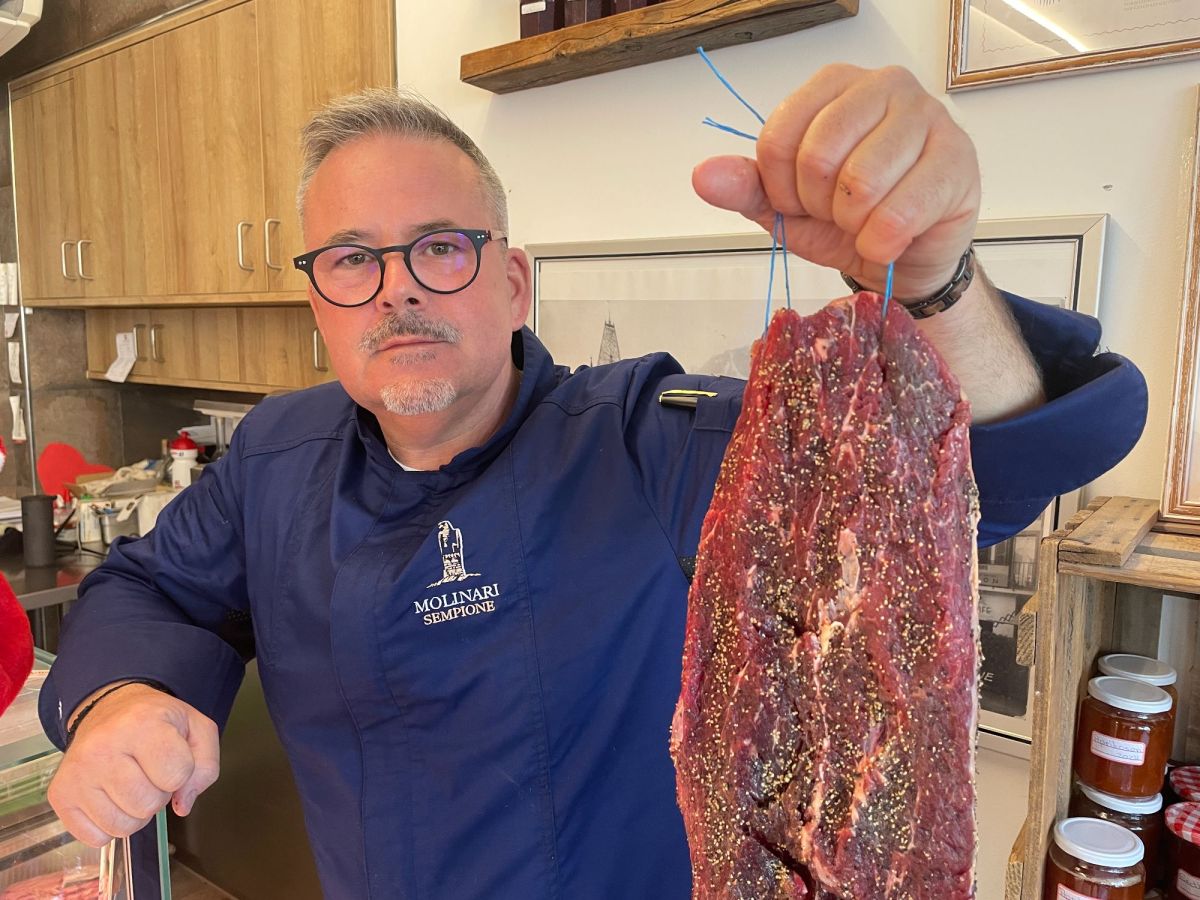 «In unserem Trockenfleisch steckt nur Handarbeit drin, es ist authentisch und ehrlich», erzählt der Walliser. «So wird es geschmackvoll und bekommt eine schöne Farbe.» Bevor er das Fleisch im Bellevue aufhängt, wiegt Molinari jedes Fleischstück einzeln und berechnet aufs Gramm, in wie viel Salz er es einlegt. So lässt er es zehn Tage ruhen – in der Nacht im Kühlschrank, tagsüber im Metzgereiladen unten in Brig. Dann mariniert er die Stücke sorgsam mit Pfeffer und Kräutern aus seinem Garten – etwa Lavendel, Thymian, Majoran und Salbei. Packt sie in Säcke ein, fährt auf den Simplonpass und hängt sie im Bellevue auf – wo sie zwei bis vier Monate an der frischen Alpenluft trocknen.